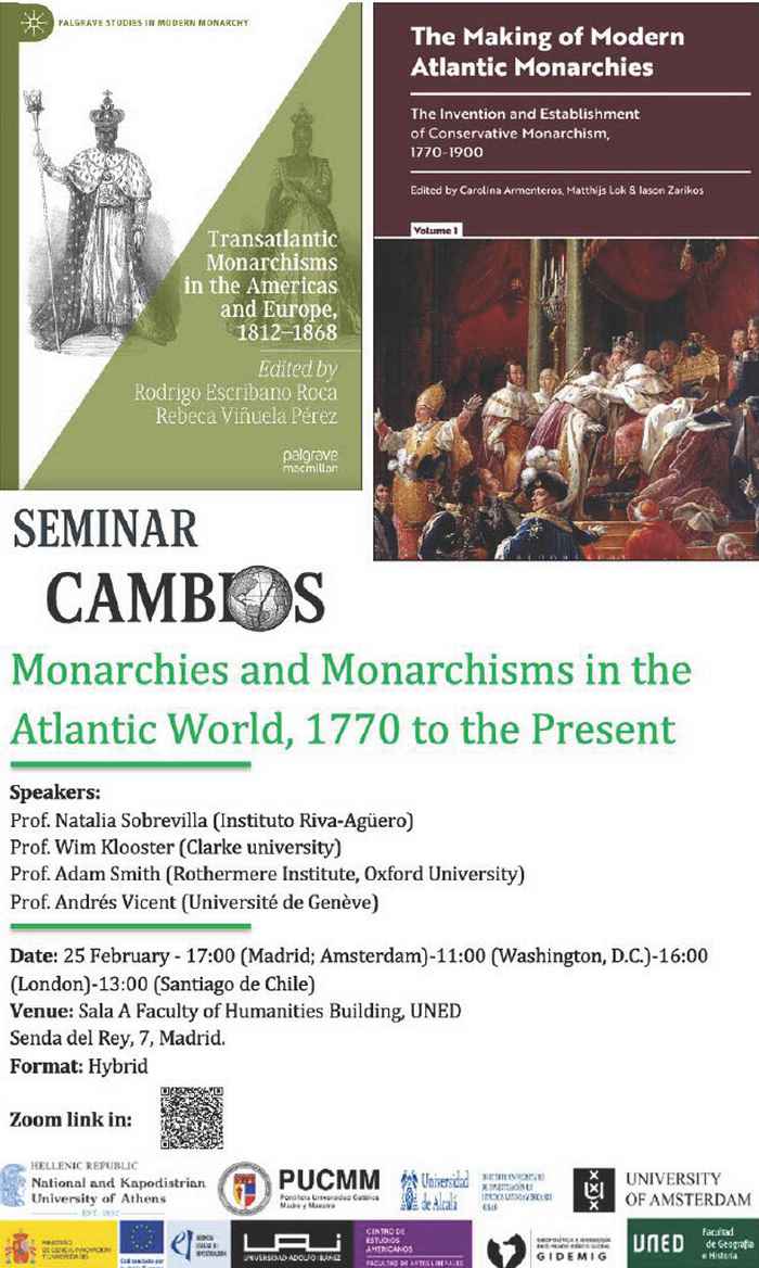 The seminar Monarchies and Monarchisms in the Atlantic World, 1770 to the Present offers a forum for debate on the historical evolution of monarchies and, centrally, on monarchism as a transnational political ideology in the Atlantic world from the age of revolutions to the present. Through the presentation and discussion of two recently published volumes—Making of Modern Atlantic Monarchies (Bloomsbury) and Transatlantic Monarchism in the Americas and Europe (1812–1868) (Springer)—the seminar seeks to analyse the capacity of monarchies to adapt in contexts of imperial collapse, constitutional experimentation, and the formation of new political orders.