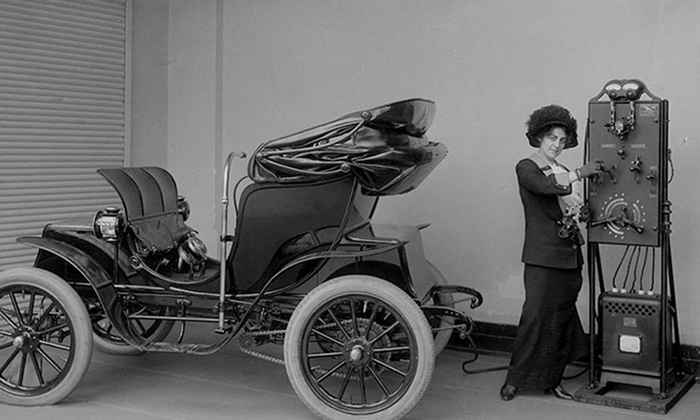 An electric car with its charging apparatus. (Getty: Corbis/Hall of Electrical History Foundation)