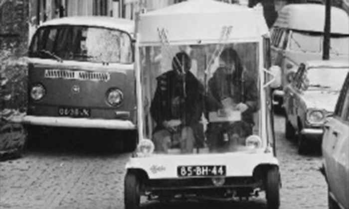 De Witkar in het verkeer, ca. 1974 (Rob Mieremet / Anefo). A later Witkar model operating in central Amsterdam around 1974. This version features a license plate, mirrors windshield wipers, and refined bodywork.